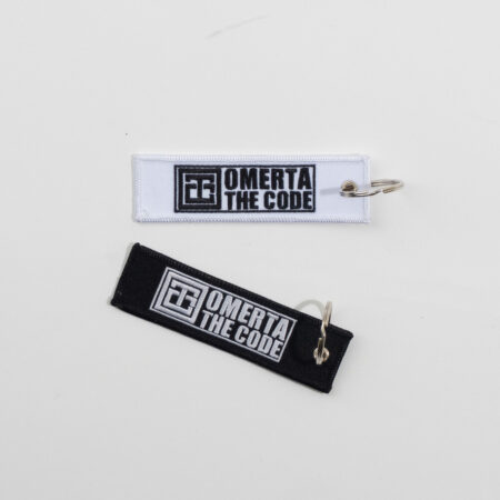 Double-sided “Omerta The Code” embroidery on tough, hand-stitched webbing, offered in black or white so you can pick your side. The metal split ring shrugs off pulls, while the square emblem is a constant reminder the Code is always with you.
