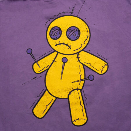 Back side: a handmade voodoo doll, pins and all, delivers a double message: part protective charm, part warning that says, “I know the Code, watch your words.”