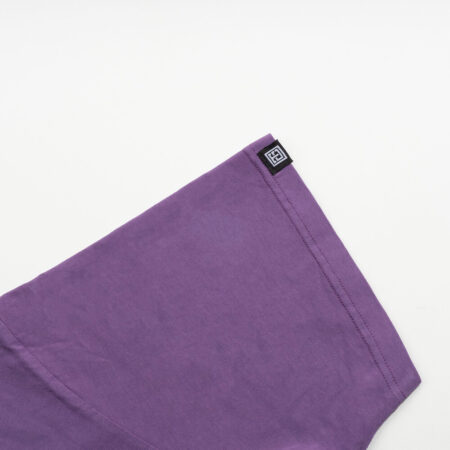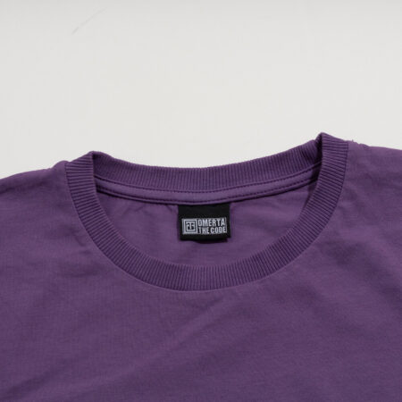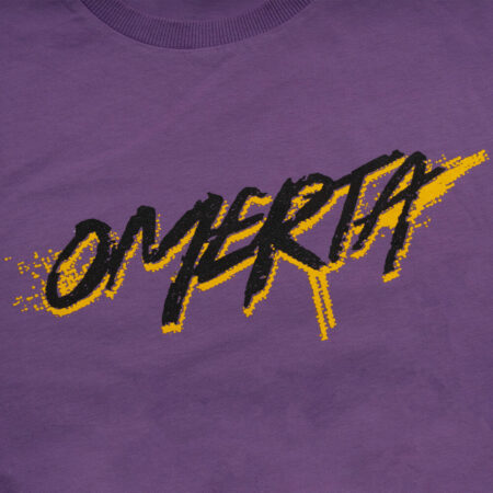 Purple T-Shirt with a black Omerta signature and yellow paint splatters cutting through the backdrop, a move that needs no explanation.