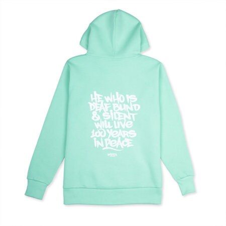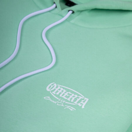 Mint hoodie with white Omerta Logo in front and an Omerta quote in back design.