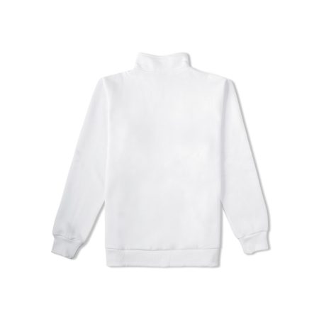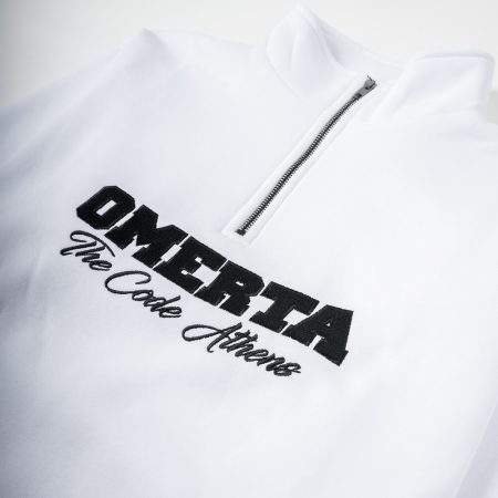 Crisp white with street intent: the stand collar and half-zip keep the profile sharp, while the Athens Code chest mark speaks in calm confidence. Layer over a T-shirt or wear solo—clean, composed, all day.