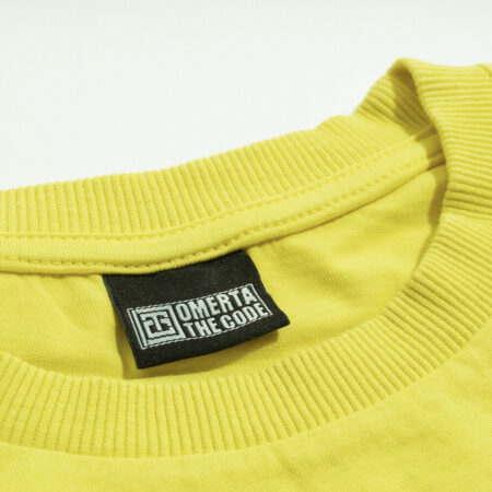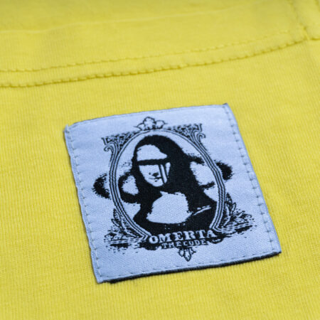 Mini Mona Lisa on the pocket, dazzling yellow that draws looks. Wear the smile that keeps Omerta’s secrets.