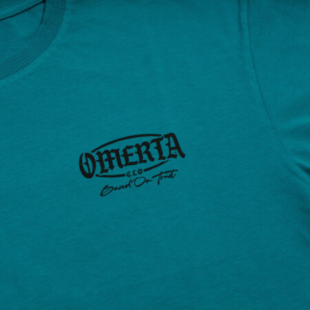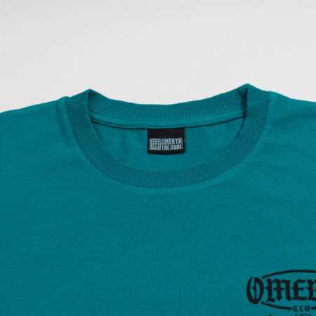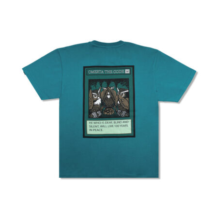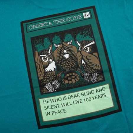 Yu Gi Oh Turquoise Omerta T-Shirt. Three symbols of silence stand like a shield on the back, a reminder that he who sees nothing, hears nothing and says nothing lives a hundred years in peace.